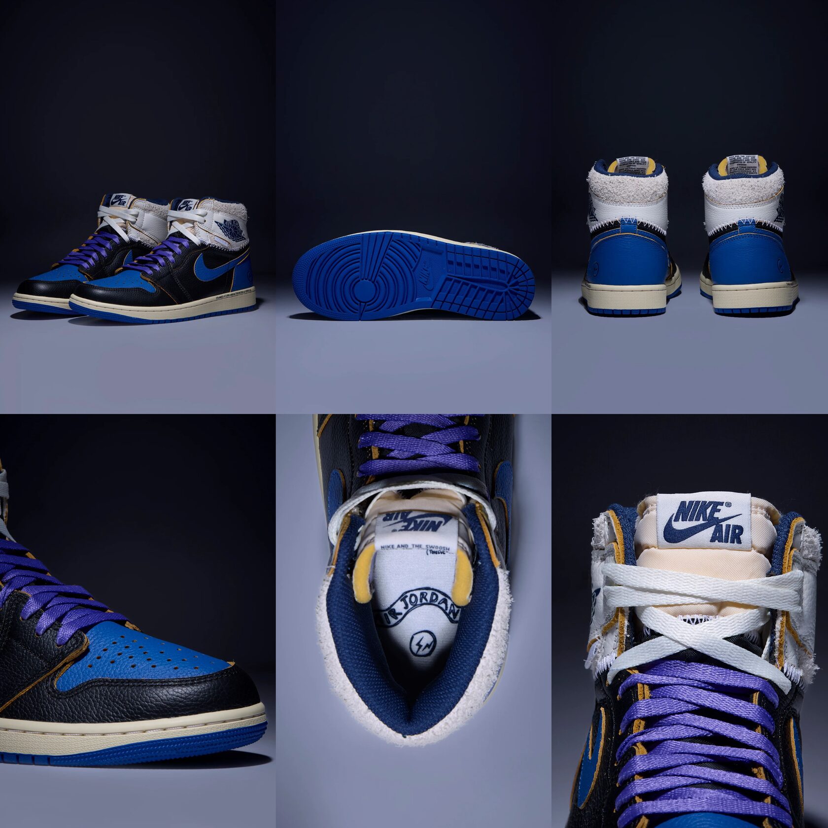 Чёрный верх из кожи, глубокие синие акценты, винтажная мидсоль Sail и минимальное количество контраста создают ощущение взрослого, выверенного дизайна. Здесь fragment говорит шёпотом, Union не разрушает форму, а Jordan остаётся каноном.