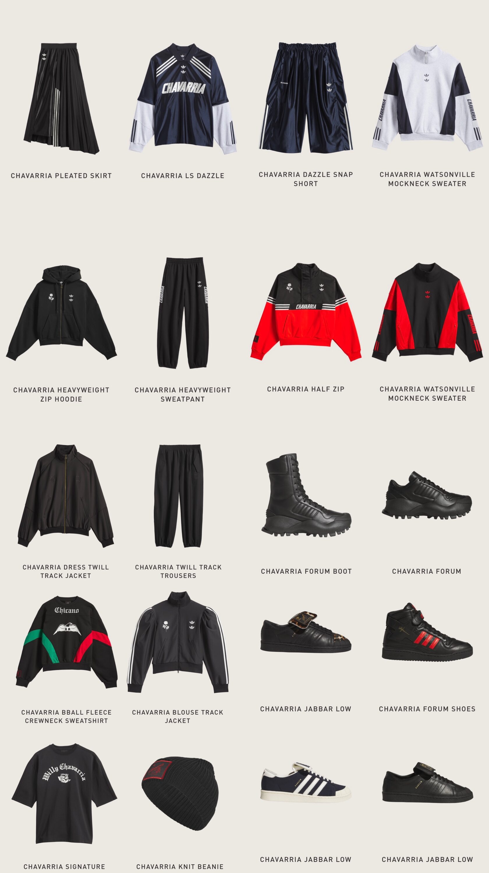 Главный символ коллекции — Chicano Sweatshirt, прямое обращение к культурным истокам дизайнера. Объёмный крой сочетается с вышивкой CHICANO, эмблемой орла и аппликациями adidas и мексиканского флага — вещь становится визуальным жестом гордости и самоуважения.